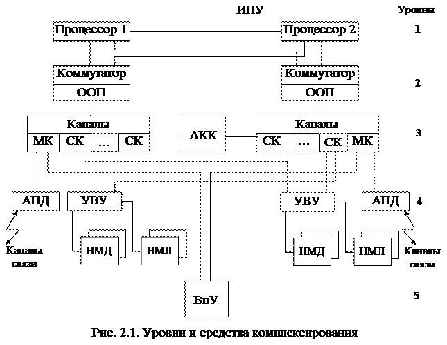 В создаваемых ВС стараются обеспечить несколько путей передачи данных, что позволяет достичь необходимой надежности функционирования, гибкости и адаптируемости к конкретным условиям работы. Сочетание различных уровней и методов обмена данными между модулями ВС в наиболее полной форме нашло свое выражение в универсальных суперЭВМ и больших ЭВМ. В этих машинах предусматривались следующие уровни комплексирования (рис.2.1):
