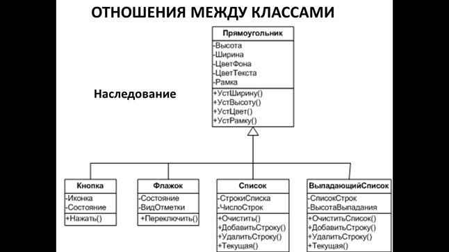 Наследование отражает стремление представить систему в виде нескольких уровней. По этой причине чаще употребляют термин «иерархия наследования». Наследование между классами дает возможность передавать поведение, свойства, а так же структуру класса в целом.