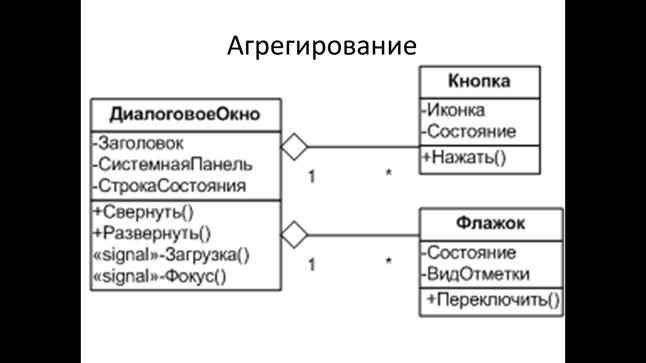 Второе соотношение, которое связывает классы – это агрегирование. Отношение агрегирования предусматривает, что экземпляры одного класса объектов могут включать экземпляр других классов.