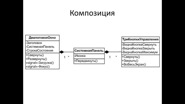 Композиция классов – это отношения подобные агрегированию, но отличающиеся тем, что требуется обязательное существование экземпляров классов, входящих в отношения.