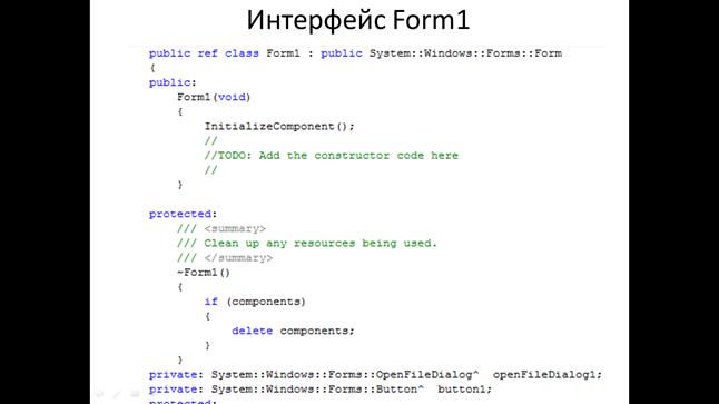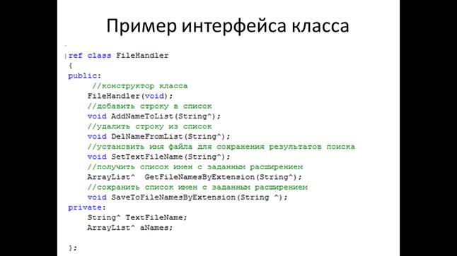 Интерфейсом класса называют описание наименований и типов, его свойств и методов. Зная интерфейс можно получить ту функциональность, которая заложена в классе.