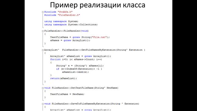 Реализация класса состоит из программного кода методов.