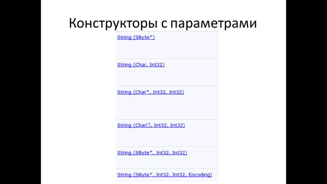 Конструкторы с параметрами предназначены для того, чтобы создавать непустые экземпляры объектов. В качестве параметра конструктора задаются исходные данные для конструирования. Ими могут быть в частности любые другие типы или классы. В программном коде компилятором перегружается нужный конструктор. Например, объект строка может иметь конструктор для целых чисел, чисел с плавающей точкой, символьных массивов и т.д.