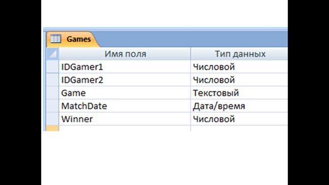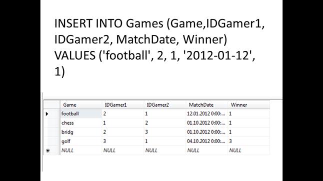 INSERT INTO Games (Game, IDGamer1, IDGamer2, MAtchDate, Winner) VALUES (‘football’, 2, 1, ’2012-01-12’, 1)