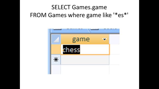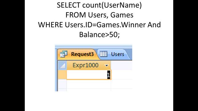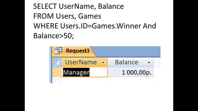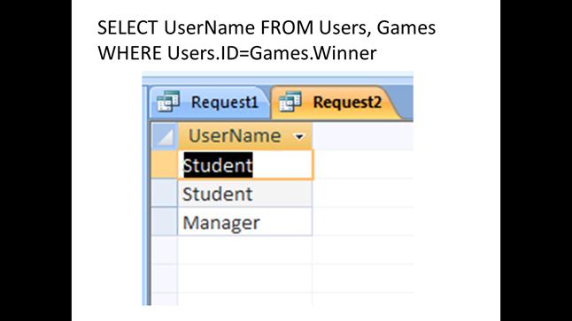 SELECT UserName FROM Users, Games WHERE Users.ID=Games.Winner; – в данном примере запрашивается результирующая таблица, в которой должен присутствовать только столбец UserName. Записи отбираются из пары таблиц Users и Games по условию, которое задается с помощью ключевого слова WHERE. Условием отбора в данном случае, является совпадение значений поля ID таблицы Users и поля Winner таблицы Games. Запрос на естественном языке можно сформулировать так, отобрать имена всех победителей в играх.