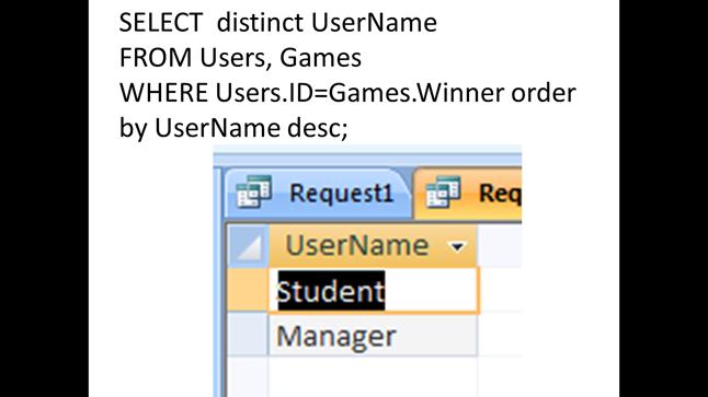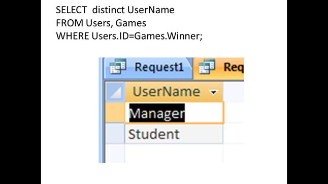 SELECT distinct UserName FROM Users, Games WHERE Users.ID=Games.Winner; Чтобы устранить повторяющие записи в результате используют ключевое слово distinct (различные).