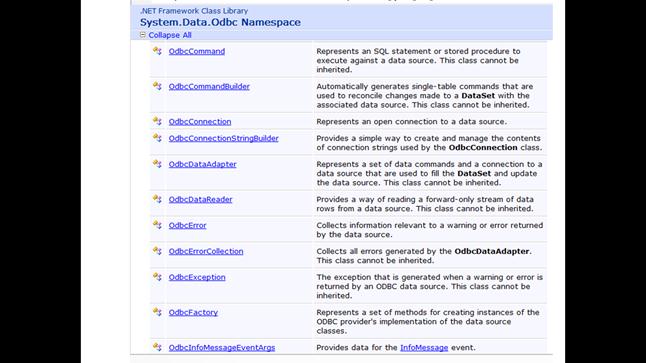 В пространстве имен ODBC имеются классы для работы с источниками данных ODBC: