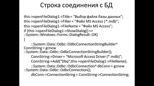 В библиотеке.Net для конструирования строки соединения имеется специальный класс OdbcConnectionStringBuilder. Его свойства и методы позволяют сконструировать строку соединения. Использование этого класса не является обязательным. Если программисту точно известна строка соединения, ее можно использовать напрямую.
