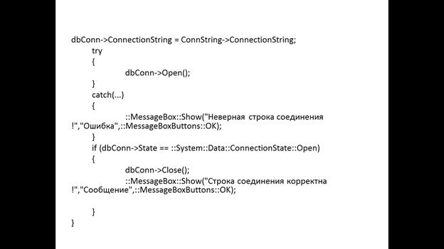 Для установления соединения используются объекты класса OdbcConnection. Программа в начале конструирует пустой объект, при этом никаких значений по умолчанию он не содержит. Его свойство ConnectionString должно содержать строку соединения.