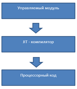 Программный модуль ну промежуточном языке в момент исполнения обрабатывается JIT (Just In Time) компилятором. Этот компилятор транслирует код из промежуточного языка в процессорный код. Дополнительный уровень компиляции позволяет в большей степени учесть особенности конкретного процессора (Число ядер, специфические команды). JIT –компилятор преобразует не весь код, а только часть, которая исполняется в данный момент.