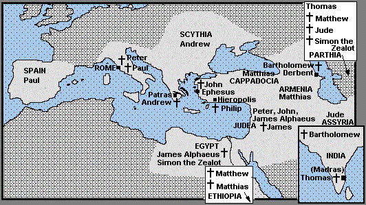 | Андрей | Малая Азия, Армения, Абхазия, Скифия. | Патры (70 год), распят на кресте. | 30 ноября | |