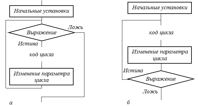 Цикл с постусловием реализует структурную схему, приведенную на рис. 8.1 б.