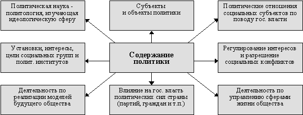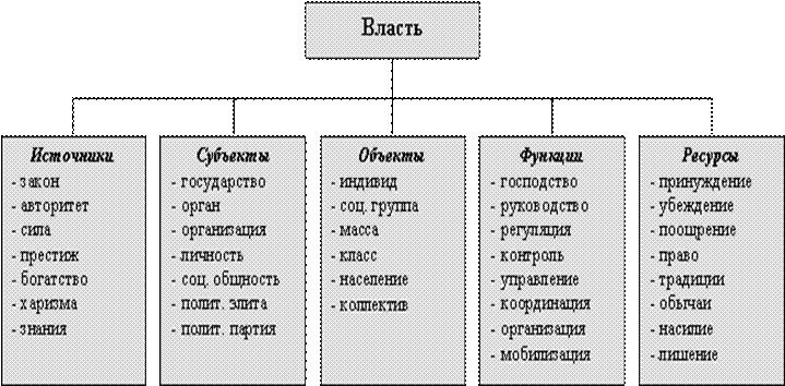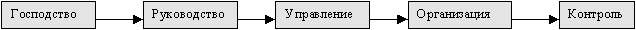 - господство - основано на разделении общества на управляющих и управляемых (законы); - руководство - заключается в выработке и принятии властью важных для общества решений, в организации управляемых по осуществлению этих решений; - управление - использование полномочий власти по формированию целенаправленного поведения объектов; осуществляется через систему правительственных органов и административный аппарат; - организация - согласование, упорядочение и обеспечение взаимосвязи действий отдельных людей, групп, классов, учреждений и организаций; Примечание: Управление и руководство осуществляются по вертикали (от руководителя и управленцев к подчиненным). Организация производится в горизонтальной плоскости (взаимодействие между партиями, организациями, районами, областями и т.п.). - контроль - способность властных органов постоянно следить за тем, как реализуются законы, указы и распоряжения власти.