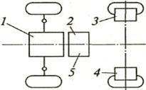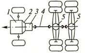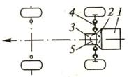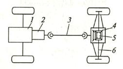 3 − коробка передач; 4 − карданная передача; 5 − ведущий мост; 6 − главная передача;