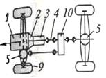 В гидрообъемной трансмиссии (верхняя половина рисунка 1.4) двигатель 1 внутреннего сгорания приводит в действие гидронасос 2, соединенный трубопроводами с гидромоторами 3, валы которых связаны с ведущими колесами автомобиля. При работе двигателя гидродинамический напор жидкости, создаваемый гидронасосом в гидромоторах ведущих колес, преобразуется в механическую работу.