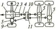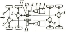 10 − раздаточная коробка; 11 − межосевой дифференциал