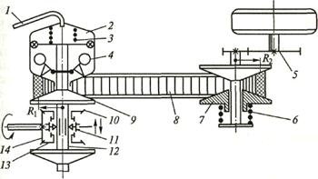 7, 9 − шкивы; 8 − ремень; 10, 13, 14 − шестерни; 11 − муфта; 12 − вал