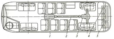 На рисунке 1.6 показана схема электромеханической трансмиссии автобуса большой вместимости. Двигатель 4 внутреннего сгорания расположен в задней части автобуса и приводит в действие генератор 5. Ток, вырабатываемый генератором, подводится к электродвигателю 1. Крутящий момент от электродвигателя через карданную передачу 2 подводится к ведущему мосту 3 и далее через главную передачу, дифференциал и полуоси к ведущим колесам автобуса. Сцепление и коробка передач в трансмиссии отсутствуют.