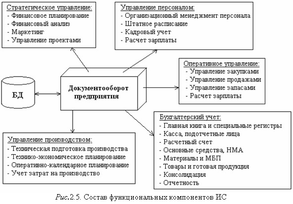 Функциональные компоненты – модели, методы и алгоритмы получения управляющей информации – составляют содержательную основу ИС. Функциональная структура ИС – совокупность функциональных подсистем, комплексов задач и процедур обработки информации, реализующих функции системы управления. Состав функциональных компонентов ИС представлен на рисунке.