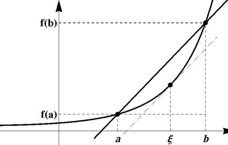 Доказательство. Теорема утверждает, что существует точка (^, в которой угловой коэффициент касательной f '(<^) такой же как у секущей к = tga = ъ-а ■> '^- ^- касательная параллельна секущей. Возьмем прямую, паралл - ьную секущей, и будем её опускать (поднимать) до тех пор, пока она не коснется графика, точка касания и будет точка ^. П