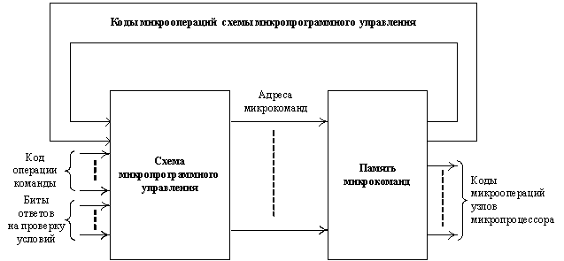 Микропрограммное управление заключается в том, что все управляющие системные сигналы записаны в ИС памяти специального назначения - микропрограммной памяти. При этом, если в ячейке памяти записана единица, это указывает на наличие управляющего сигнала. Биты, соответствующие комбинации управляющих сигналов каждого такта работы МП, образуют одно слово - микрокоманду.