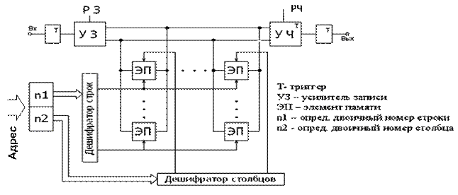 Адрес разбивается на две группы. Каждая группа (n1 и n2) подается на свой дешифратор. Выбранный элемент памяти оказывается под воздействием уровня логической единицы и в этот элемент производится запись или чтение из него. На УЗ имеется вход разрешения записи, на УЧ – вход разрешения чтения.