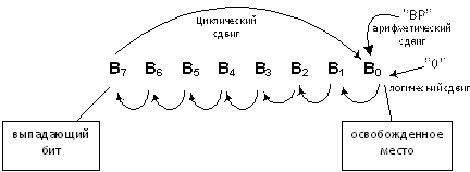 При реализации операций умножения, деления, преобразования форматов и т.д. требуется производить смещение всех бит слова на одну или несколько позиций влево или вправо. Операции сдвига - это операции параллельного смещения слов. Сдвиги подразделяются на логические, арифметические и циклические: