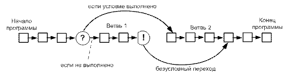 Например, условный переход производится в результате сравнения кода нажатой клавиши с константой (если код клавиши равен 0, перейти к выполнению ветви 2). В случае невыполнения условия программа продолжит последовательное выполнение программы. В конце ветви 1 стоит команда безусловного перехода. Она нужна для того, чтобы программа не начала выполнять ветвь 2 сразу после выполнения ветви 1.