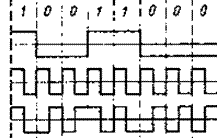 При манчестер ском кодировании каждый такт делится на две части. Информация кодируется перепадами потенциала, происходящими в середине каждого такта. Единица кодируется перепадом от высокого уровня сигнала к низкому, а нуль – обратным перепадом. Переходы производятся в середине временного интервала, отведенного каждому двоичному биту. Код Манчестер II легко получается из кода без возвращения к нулю, если последний подать на один вход схемы логической равнозначности, на второй вход которой подан синхросигнал в виде меандра с периодом, равным периоду кода БВН, и синфазный с ним. Например:
