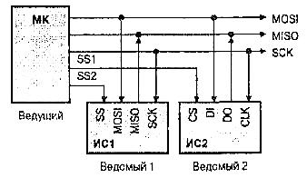 В рассматриваемом примере МК является ведущим устройством, он инициирует обмен при передаче информации между МК и одной из периферийных ИС. Каждая из периферийных ИС является ведомым устройством. SPI-шина представлена тремя общими линиями связи (MISO, MOSI, SCK) и двумя линиями выбора ведомого устройства (SS1, SS2), которые индивидуальны для каждой периферийной ИС: