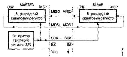 Скорость обмена устанавливается программно. Максимальная скорость обмена в ведущем режиме не может превышать Fтакт/2, в ведомом – Fтакт.