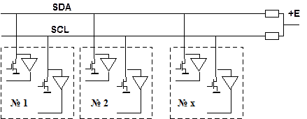 Активный уровень сигнала – низкий. Все устройства образуют на этих линиях схему "монтажного И", могут как читать, так и генерировать сигналы. Необходимый электрический режим линий обеспечивается их подключением через "подтягивающие" резисторы к цепи питания +5 В. Возможно использование ТТЛ, КМОП, или n-МОП цифровых ИС. Допускается суммарная емкость нагрузки линий шины до 400 пФ.