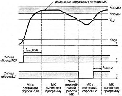 Для восстановления работоспособности МП - системы после "просадки" напряжения питания МК необходимо снова "сбросить". С этой целью в современных МК реализован дополнительный блок детектирования пониженного напряжения питания. Но и у этого модуля есть зона нечувствительности. Поэтому наличие в составе МК модуля пониженного напряжения питания значительно снижает вероятность зависания МК, но не устраняет ее полностью. Следует отметить, что уровень срабатывания модуля пониженного напряжения питания превышает напряжение сохранения данных в ОЗУ. Событие сброса по сигналу модуля пониженного напряжения отмечается специальным битом в одном из регистров. Следовательно, анализируя этот бит программно после сброса МК, можно установить, что разрушения данных не наступило, и продолжить выполнение программы.