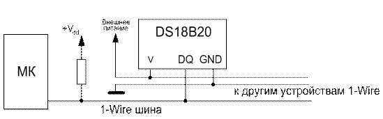 Устройства 1- Wire могут подключаться в режиме внешнего и "паразитного" питания.