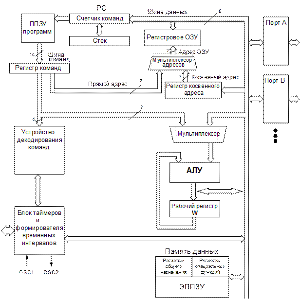 Для выполнения всех команд АЛУ использует рабочий регистр W (Work), который не может быть прямо адресован.
