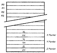 Регистровый файл SRAM занимает младшие 32 байта в общем адресном пространстве ОМК (рис.). Шесть из 32-х регистров файла могут использоваться как три 16-разрядных указателя адреса при косвенной адресации данных. Один из этих указателей (Z Pointer) применяется также для доступа к данным, записанным в памяти программ микроконтроллера. Использование трех 16-битных указателей (X, Y и Z Pointers) существенно повышает скорость пересылки данных при работе прикладных программ.