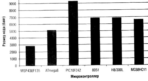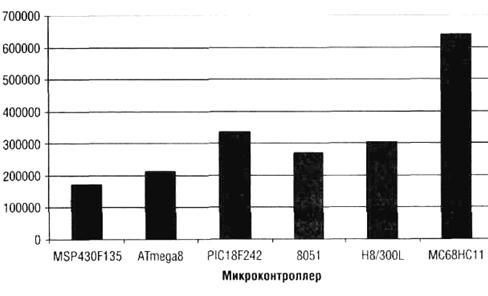 Здесь приведены результаты сравнения микроконтроллеров нескольких производителей. Для разработки кода различных простейших операций и выполнения его в режиме симулятора была использована платформа разработчика Embedded Workbench™ компании IAR Systems. Эти часто используемые приложения были выполнены на каждом микроконтроллере. Для всех рассмотренных применений были посчитаны суммарные размер кода программы и количество командных циклов, требуемых для выполнения. На рисунке 1 и рисунке 2 приведены диаграммы сравнения размеров кодов программ и количество командных циклов для каждого исследованного микроконтроллера.