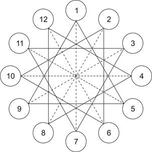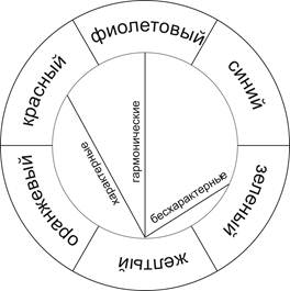 Сочетания противоположных цветов образуют гармоничные пары, а сочетания цветов у вершин треугольников – гармоничные триады.
