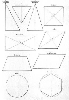 Таблицы из пособия В. В. Пукирева и А. К. Саврасова (деление отрезков, геометрические фигуры, геометрические тела) – 3 листа.