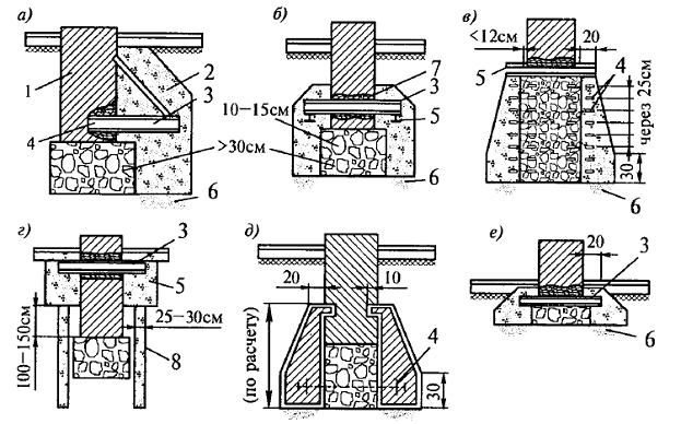 а — одностороннее усиление; б — двустороннее усиление на значительную нагрузку; в — двустороннее усиление при большой глубине заложения фундаментов; г — комбинированное усиление с устройством буронабивных свай; д, е — расширение фундаментов с устройством жестких обойм; 1 — фундамент; 2 — обойма; 3 — балки; 4 — анкеры; 5 — разгрузочные балки; 6 — щебеночное основание; 7 — заделка в существующую стену; 8 — буронабивные сваи