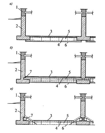 а — сплошная плита снизу фундаментных подушек; б — сплошная плита с балками на шпонках; в — сплошная плита на шпонках; 1 — кирпичная стена; 2 — фундамент; 3 — отметка верха пола подвала; 4 — рабочая арматура плиты; 5 — монолитная плита; 6 — подготовка под монолитную плиту; 7 — штрабы