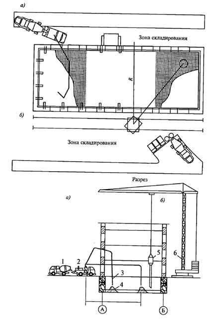 Рис. 29.7. Схемы бетонирования монолитных плит фундаментов: а — подача смеси бетононасосом; б — то же, башенным краном; 1 — бетоновоз; 2 — автобетононасос; 3 — распределительная стрела; 4 — монолитная плита; 5 — бадья; 6 — башенный кран