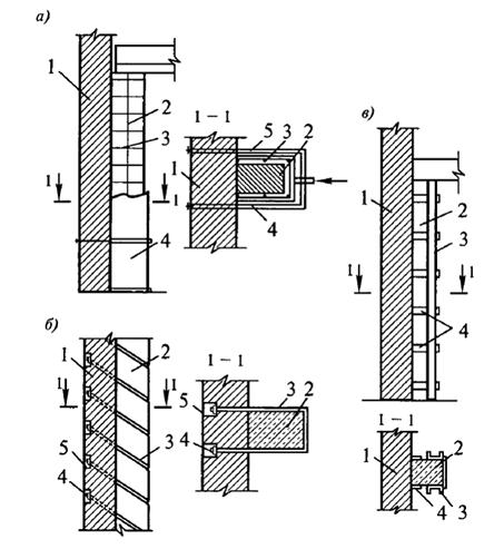 а — путем устройства железобетонной рубашки: 1 — стена; 2 — усиливаемая конструкция; 3 — арматурный каркас; 4 — опалубочные щиты; 5 — стяжные хомуты; б — путем установки напрягаемых хомутов для включения в работу стен: 1 — стена; 2 — колонна; 3 — хомут; 4 — анкерное устройство с натяжением; 5 — штраба; в — путем установки боковых разгружающих элементов: 1 — стена; 2 — колонна; 3 — швеллер; 4 — накладки из металлических полос