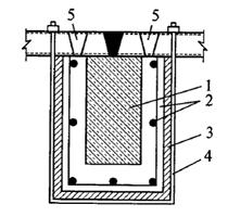 1 — усиливаемая конструкция; 2 — армокаркас; 3 — бетон омоноличивания; 4 — элементы облицовки; 5 — выступающие анкеры