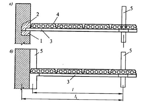 Рис. 29.16. Схемы устройства монолитных перекрытий встроенных систем: а — со свободным опиранием перекрытия на стены; б — с анкерным креплением к наружным стенам; 1 — наружная стена; 2 — монолитное перекрытие; 3 — опалубка перекрытия; 4 — прогон; 5 — опорные телескопические стойки; 6 — анкерные устройства