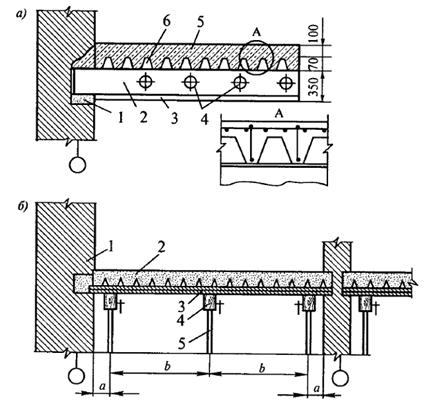 а — с использованием металлических балок и профнастила: 1 — стена; 2 — балка; 3 — подвесной потолок; 4 — технологические отверстия в сечении балки; 5 — монолитная железобетонная плита; 6 — профнастил; б — с использованием железобетонной несъемной опалубки: 1 — стена; 2 — монолитный бетон; 3 — несъемная опалубка; 4 — распределительная балка; 5 — телескопическая стойка