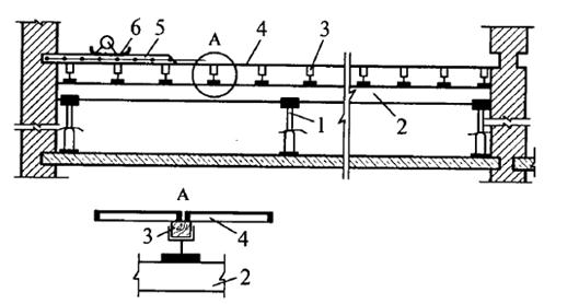 1 — телескопическая стойка с оголовником; 2 — опорные балки; 3 — прогоны; 4 — палуба из фанеры; 5 — монолитный железобетон; 6 — виброрейка