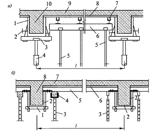 а — с поддерживающими стойками; 1 — боковой шит балки; 2 — винтовой домкрат; 3 — балочная струбцина; 4 — телескопическая стойка; 5 — поддерживающие стойки; 6 — опорная балка; 7 — ригель; 8 — палуба из фанеры; 9 — плита перекрытия; 10 — балка перекрытия; б — с использованием подвесной опалубки балок: 1 — хомут, 2 — опалубочные шиты; 3 — телескопические стойки; 4 — распределительная балка; 5 — прогон; 6 — палуба из фанеры; 7 — плита перекрытия; 8 — балка перекрытия