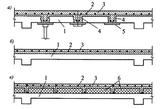 Рис. 29.17. Схемы усиления монолитных перекрытий с наращиванием верхнего железобетонного слоя: