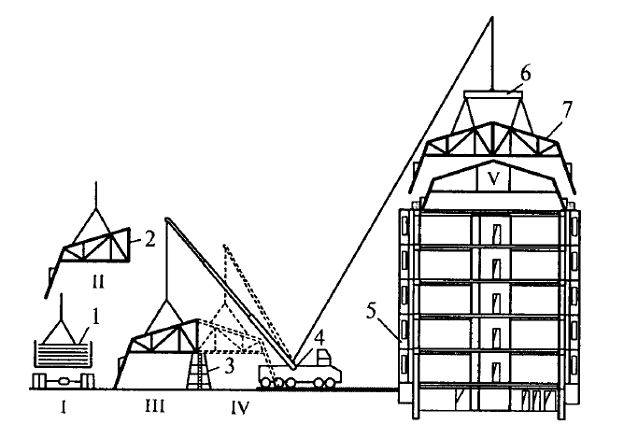 1 — объемный блок в транспортном положении; 2 — раскрытый блок; 3 — опорная площадка для укрупнительной сборки; 4 — монтажный кран; 5 — объемные эркеры; 6 — траверса; 7 — укрупненный монтажный блок; I...IV — технологические этапы производства работ
